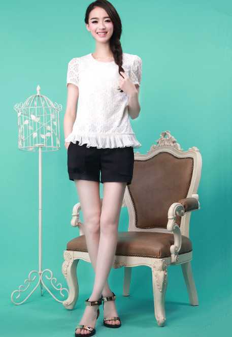 甜美感的镂空短袖衫,荷叶袖设计,很显时尚感,搭配百搭黑色短裤,显瘦又显高,搭配时尚金属黑色鞋子,穿出休闲时尚风。