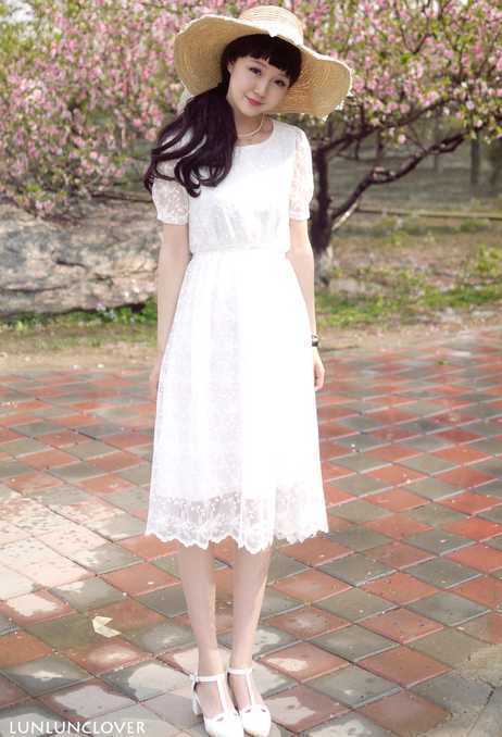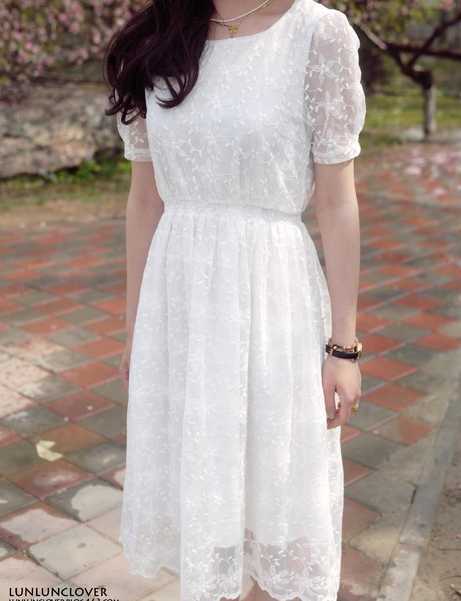白色雪纺连衣裙,高腰设计很显高挑好身材,穿着出海滩游玩很适合喔。