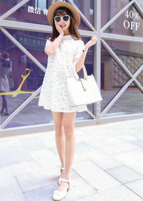 白色镂空连衣裙,百褶裙摆轻松遮肉显甜美,搭配白色蝴蝶结淑女鞋,时尚淑女气质尽展,随意拎着米白色包包,很阳光显时尚。