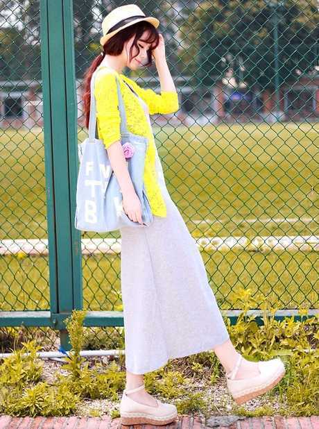 超长款韩版背心裙,完美秀出高挑纤细好身材,搭配薄款亮黄色针织开衫,衬出白皙好肤色,搭配淑女鞋子,显淑女清新范儿。