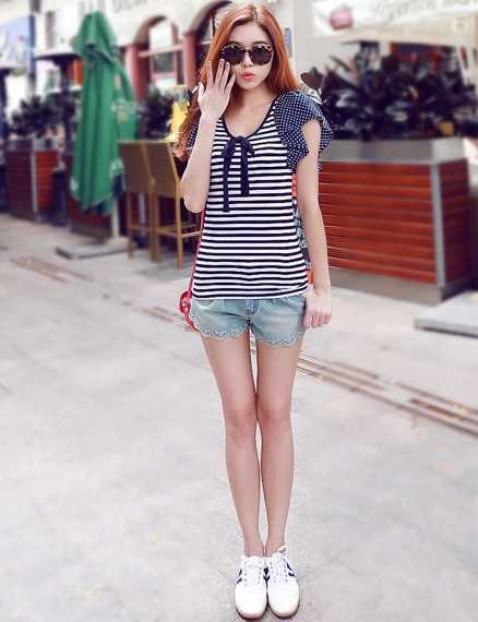 蝴蝶结夏季纯棉t恤衫,搭配超短裤,很清爽好看。