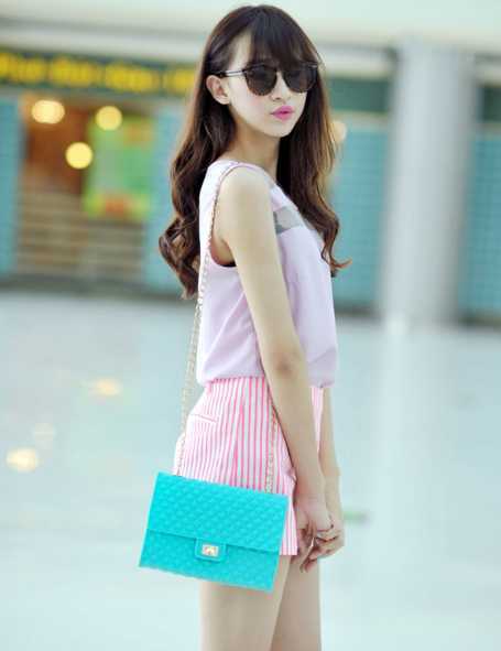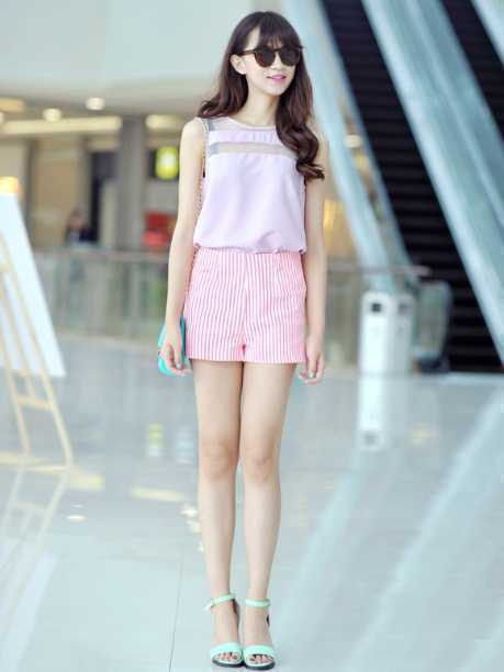 侧面看高腰荧光粉短裤,凸显纤细腰身曲线美,穿出显瘦时尚范。