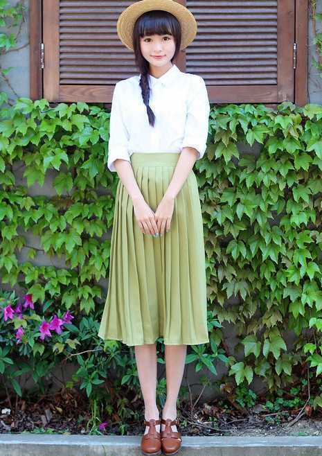 复古绿夏季雪纺裙,给人一种很清新的赶紧,搭配白色简约衬衫,更显清凉淑女风,搭配复古棕色鞋子,美翻的仙女气质尽展。