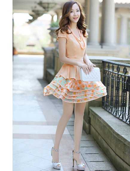 橙色雪纺碎花蛋糕连衣裙,橙色小碎花更清新亮眼,搭配白色铆钉高跟鞋,凸显婀娜多姿好身材,搭配橙色饰品,更彰显时尚感,让你随风舞动起来,美翻咯。
