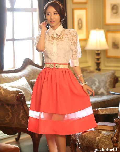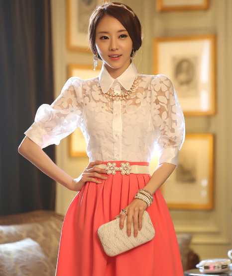 减龄甜美款韩国雪纺衫,唯美蕾丝拼接,朦胧透视尽展优雅性感,搭配高腰蓬蓬半身裙,让你穿着时尚不低俗,优雅做个淑女吧。