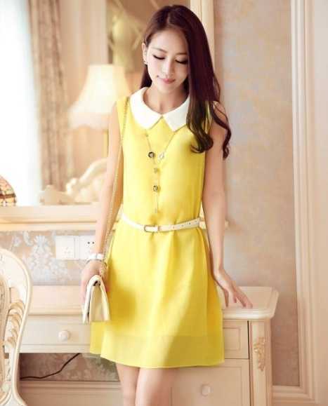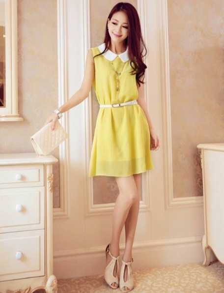 养眼黄色娃娃领背心裙,柔软雪纺材质,炎夏穿着清凉透气,搭配白色细腰带,修饰出黄金比例好身材,搭配米色镂空高跟鞋,性感撩人。