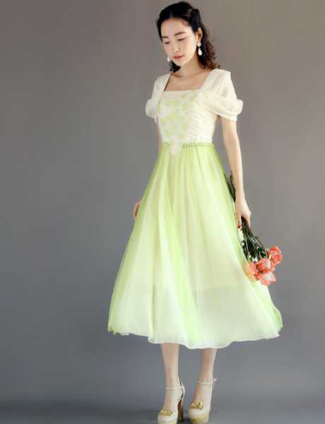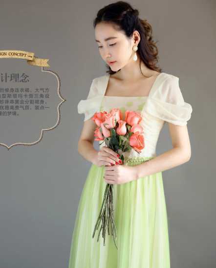 复古宫廷式雪纺连衣裙,亮眼的薄荷绿衬出白皙好气质,搭配蝴蝶结淑女高跟鞋,演绎出甜美公主范,手捧着一束粉色玫瑰花,宛如花仙子出现在眼前。