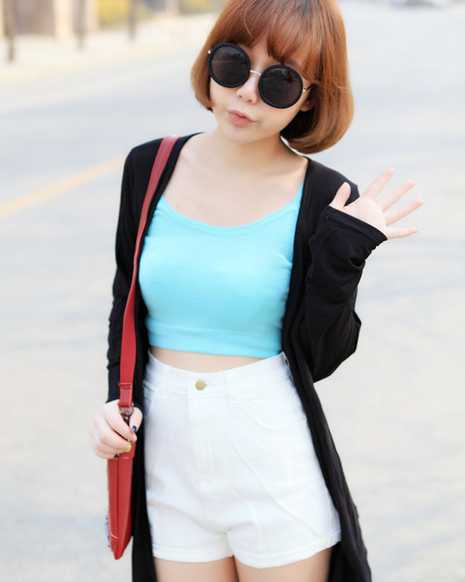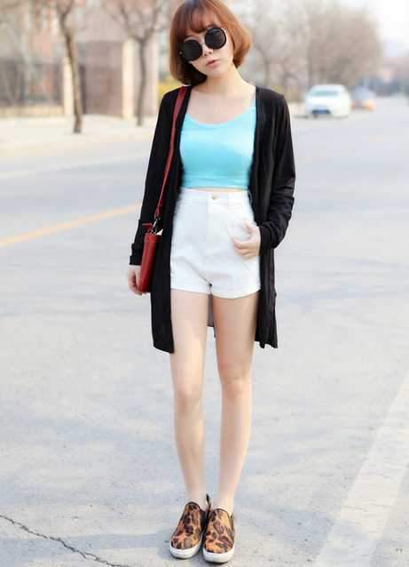 纯白色夏季短裤,高腰版型凸显小蛮腰,搭配超短款背心衫,清凉又显曼妙身材,在炎热夏天外搭一件薄款外套,既能防晒又能提升时尚味。