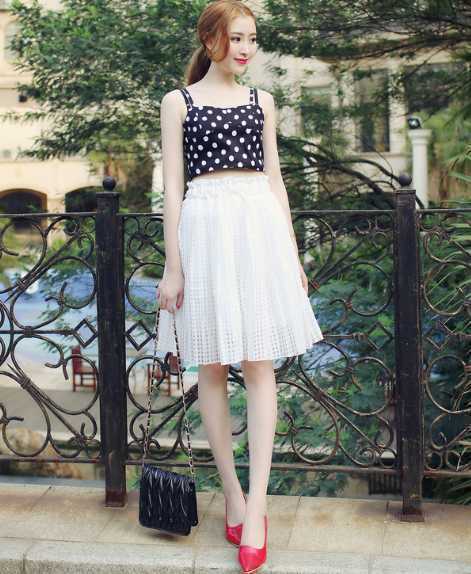 黑色复古波点裹胸背心衫,修身显瘦版型,凸显傲人美胸,搭配高腰雪纺半身裙,性感又仙美,加上黑色高跟鞋搭配,更凸显 性感复古韵味。