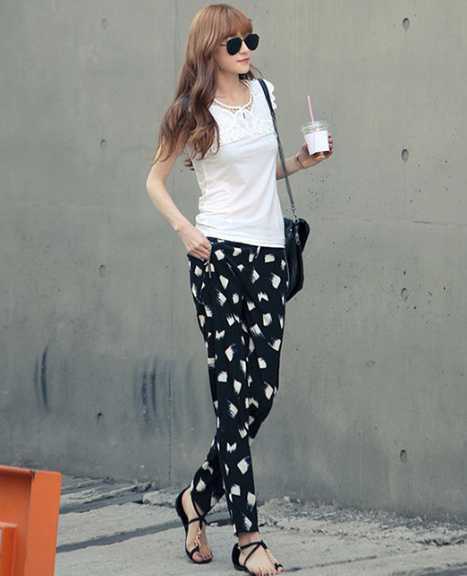 抽象的几何印花裤子,搭配白色t恤,清纯和时尚品味统统完美展现。