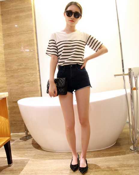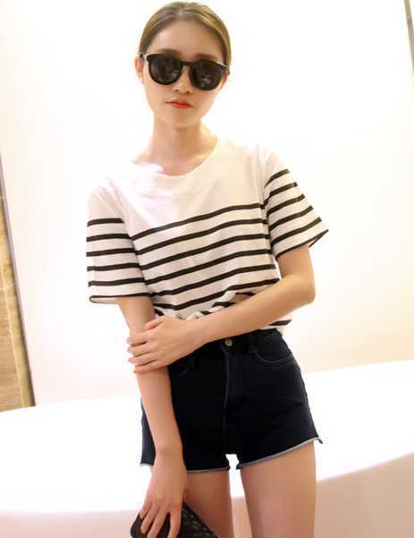 经典休闲的黑白条纹 t恤衫,时尚百搭,束腰搭配清爽型的牛仔短裤,帅气中带点甜美感,穿上超舒适感的黑色平底鞋,舒适百搭还很显腿细喔。
