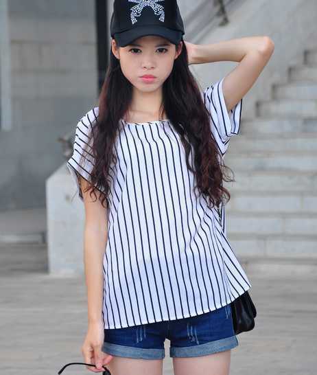 雪纺休闲条纹t恤衫 ,很有运动风的一款 ,搭配微卷裤脚的牛仔短裤,时尚休闲,搭配运动休闲鞋,轻松打造出街头运动休闲style。