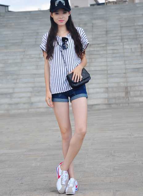 休闲短袖条纹t恤衫,搭配超短款牛仔短裤,显瘦又清爽,让你清凉过一整个夏天。