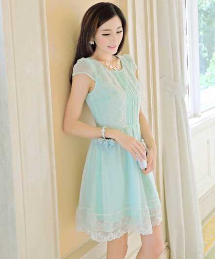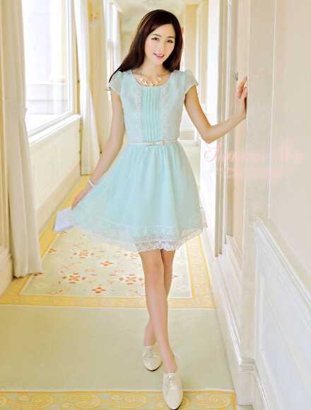 侧面看一款夏季纱裙,裙摆拼接白色蕾丝,满足了女生对浪漫的追求,让你更具女人味。