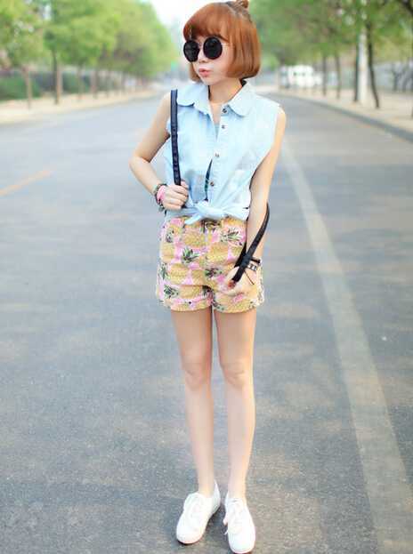 糖果色的夏季背心衫,为炎热的夏天带来一丝丝凉意的感觉,搭配帅气无袖牛仔衫,随性自然,搭配高腰碎花短裤,秀出纤细美腿更凉爽喔。