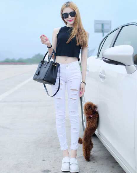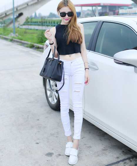 超短款t恤衫搭配酷气破洞小脚裤,塑造出小细腿,搭配蝴蝶结白色鞋子和黑色包包,一身经典黑白搭配穿出永不落伍造型。