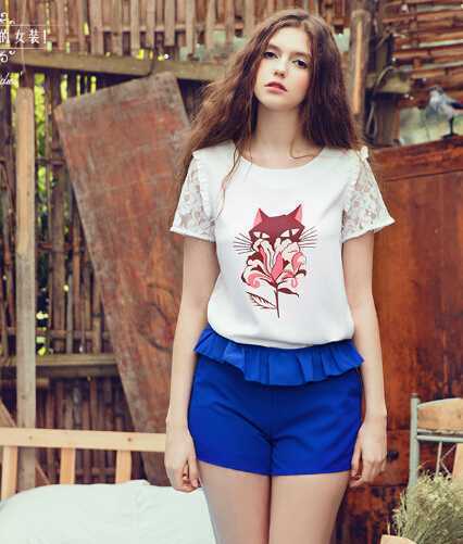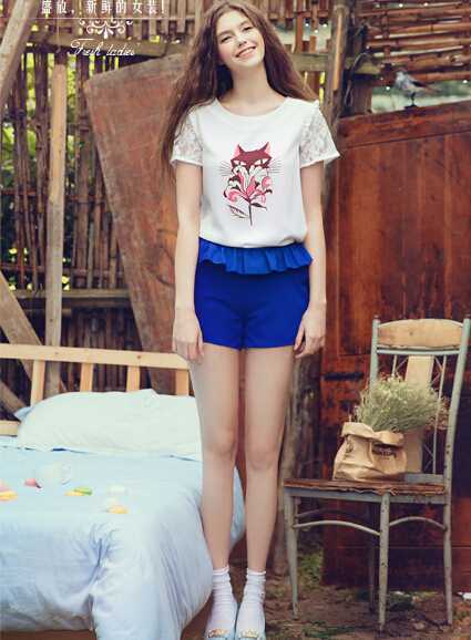 可爱小猫咪欧美风夏季t恤衫,增添可爱俏皮感,搭配蓝色荷叶边短裤,穿出清爽时尚欧美范,搭配蓝色平底鞋,很舒适时尚。