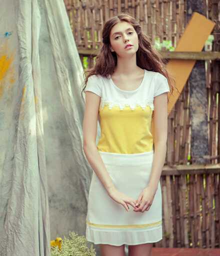 夏季黄色t恤衫,仙美白色蕾丝点缀增添小女人味道,让MM穿上更显甜美气质。