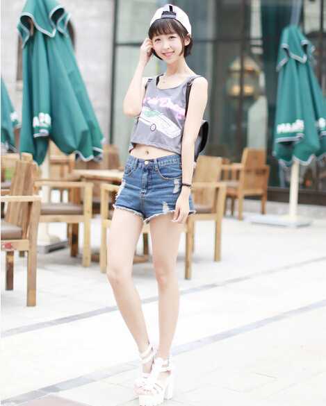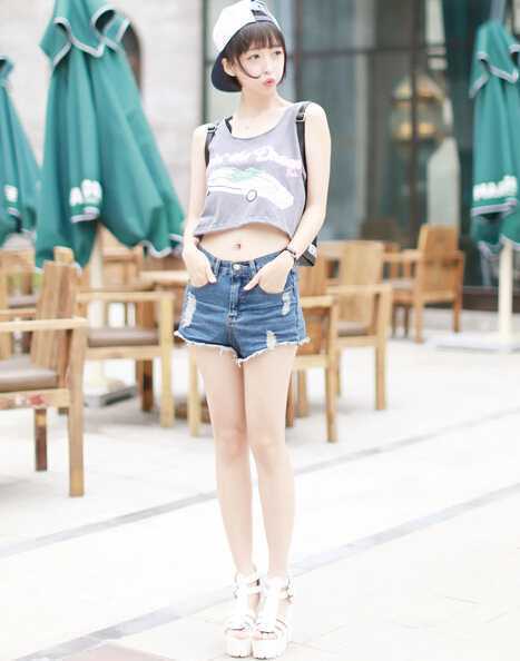 休闲街头风的印花t恤衫,超短款设计恰当好处露出 小蛮腰,秀出性感妩媚,搭配个性破洞牛仔短裤,帅气不失随性感,帽子调转戴上,给人一种甜美假小子的感受,街头帅气范穿出来。
