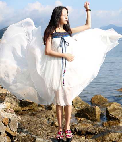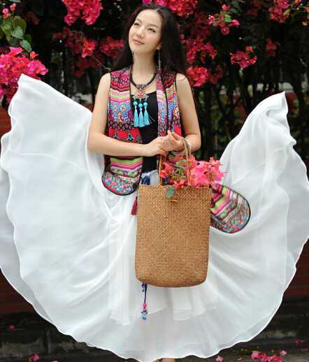 随风摇曳的大裙摆连衣裙, 宛如一个美丽的蝴蝶在飞,很美丽动人,搭配民族风马甲,瞬间提升时尚度,穿出优雅气质,玩转民族时尚风。