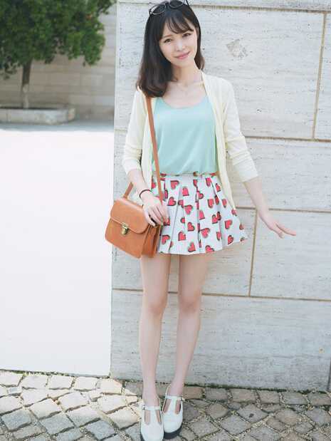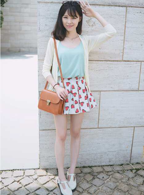 小清新马卡龙雪纺背心搭配短裙,可爱粉色小爱心点缀,增添时尚度,让MM穿出更凉爽可爱,白色平底鞋穿出时尚look。
