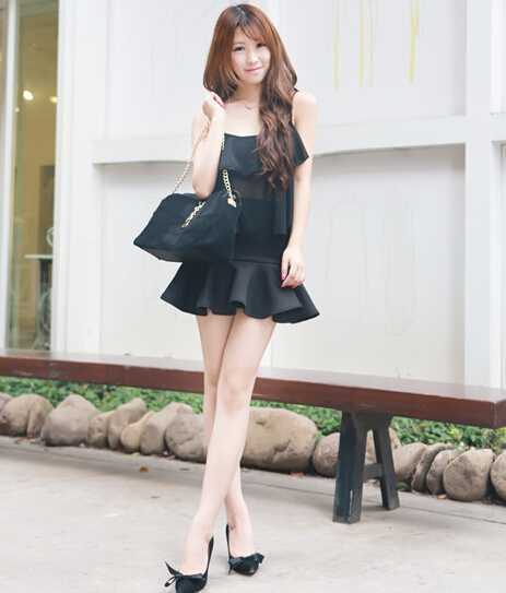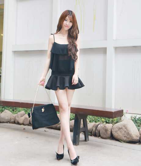 一身黑色很有气质,微透视荷叶边背心衫,不局限与高温的夏天,一阵微风吹来,享受清凉的感受,搭配百褶短裙,甜美可爱秀美腿。