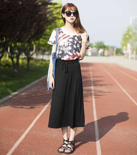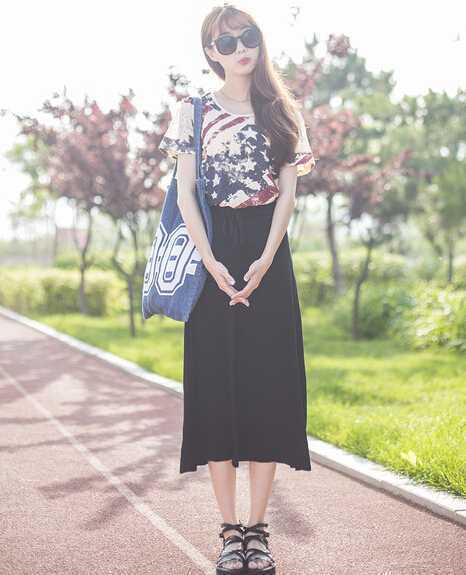 t恤衫是炎热夏天最受欢迎的单品,搭配飘逸雪纺半身裙,很好的遮住粗腿显高挑,搭配黑色细带凉鞋, 出游就穿不累。