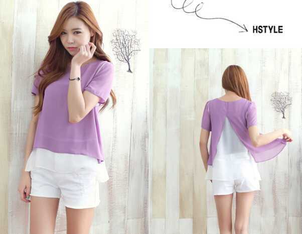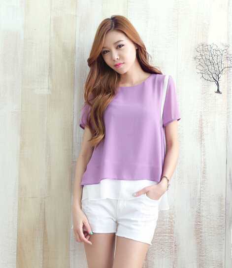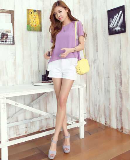 糖果色紫色雪纺衫,玩转色彩时尚感, 不规则的衣摆设计,增添时尚品味,简单搭配白色短裤,休闲时尚兼备,配上高跟鞋,高挑显气质喔。