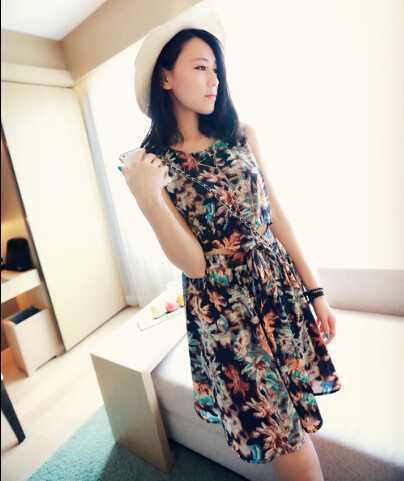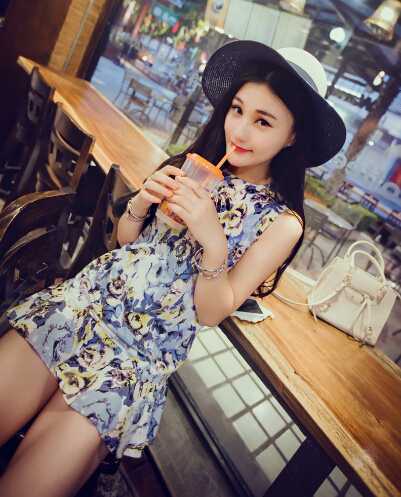 深蓝色印花雪纺裙,柔美飘逸的雪纺惹人爱,搭配链子迷你包,很时尚喔,戴上超大沿的编织帽, 防晒又 时髦。