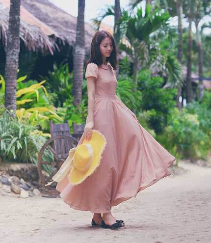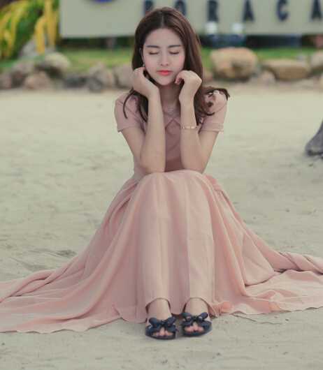裸粉色的夏季长裙,飘逸很仙美,随风飘动的裙摆,展现出女性柔美的一面,搭配蝴蝶结平底鞋,淑女甜美。