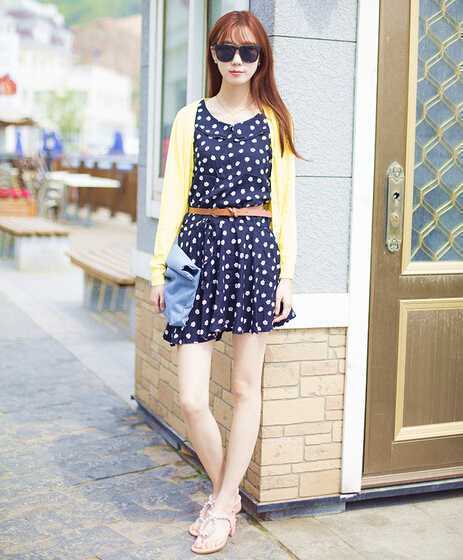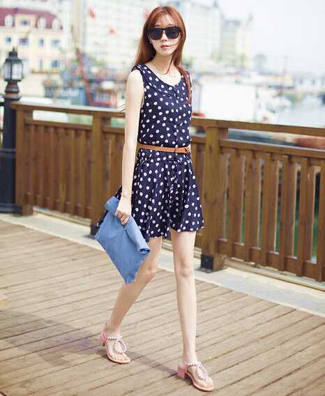 背心波点连衣裙,闷热的夏天不惧怕热,简单的搭配细腰带,拉长身体比例狠享瘦。