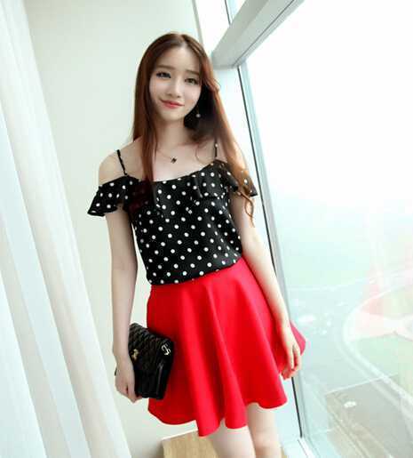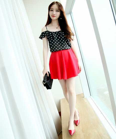 黑色夏季露肩波普风雪纺衫,很百搭显性感味道哦,搭配红色短裙,更具 女人味,加上一对亮漆皮高跟鞋,瞬间提升你气质。