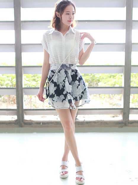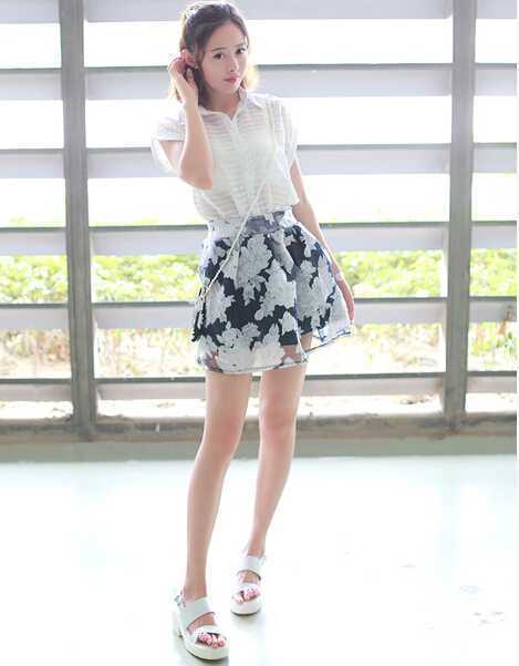气质款透视雪纺衫,自然流露出性感的味道,搭配碎花短裙,穿出青春活力感,散发出少女般的甜美度哦。