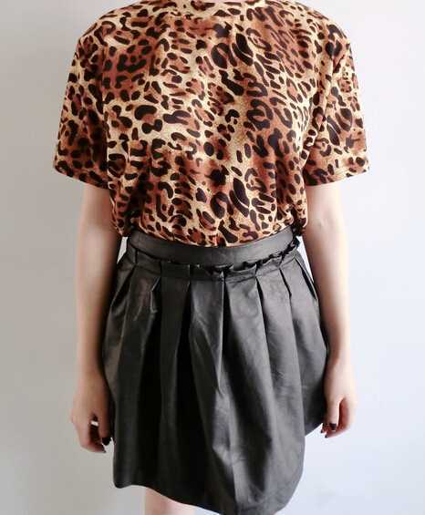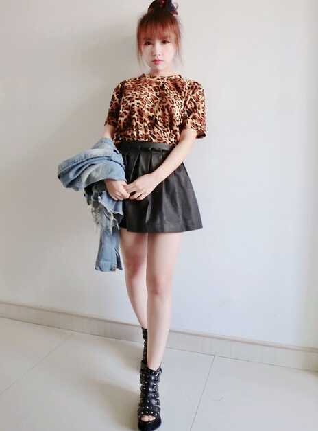 t恤衫搭配短裙是极佳的组合哦,融入了豹纹的时尚元素,为你造型增添几分亮点。