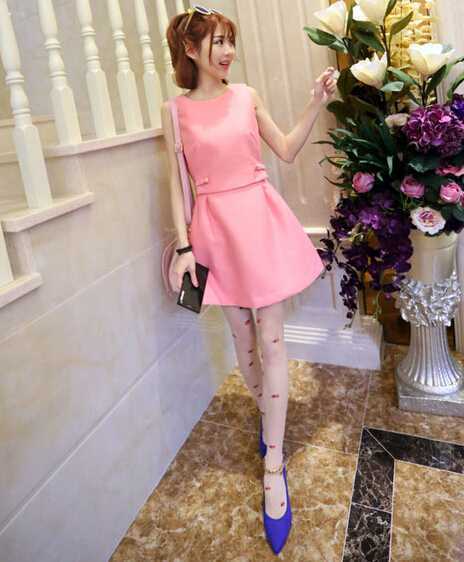 桃粉色的许多女生不可抗拒的颜色,桃粉的无袖连衣裙,更是大受欢迎,收腰式腰间设计,凸显出纤细的腰身,加上高贵 宝蓝色高跟鞋,穿出你的甜美气质。