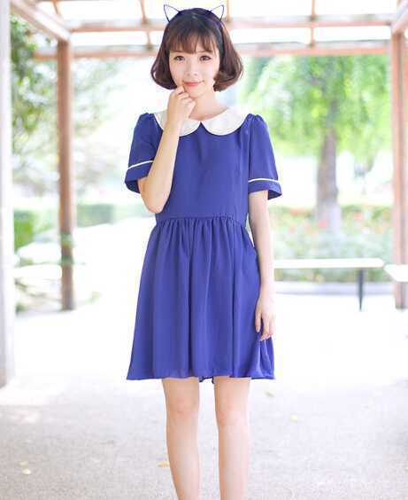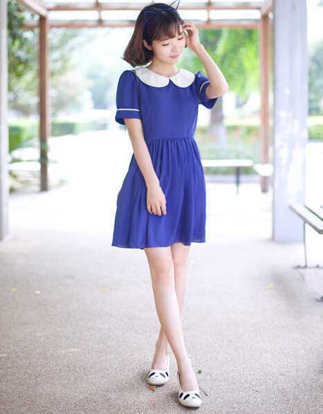 宝蓝色的气质款连衣裙,衬出白皙肤色很显气质呢,娃娃领设计减龄甜美哦,搭配可爱的小猫咪发箍,轻松穿出小清新可爱feel。