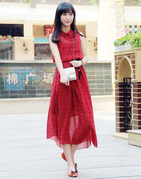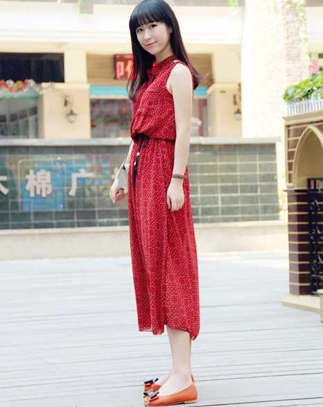 复古的鲜红色雪纺连衣裙,飘逸的雪纺尽展出柔美的女人味,搭配蝴蝶结鱼嘴平底鞋,舒适又甜美哦,加上迷你包包,彰显出精致优雅女人的一面,很迷人。