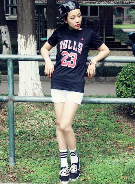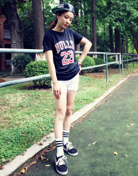 休闲运动款的t恤衫,搭配白色短裤超清凉的哦,搭配白色袜子和帆布鞋,潮流时尚的穿衣法,配上嘻哈帽,完美演绎出朋克风中性美。