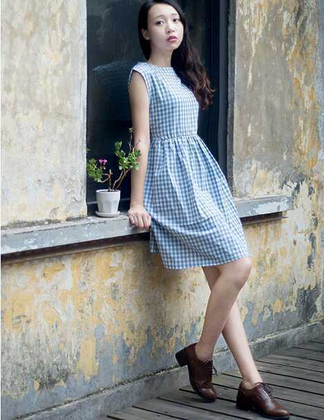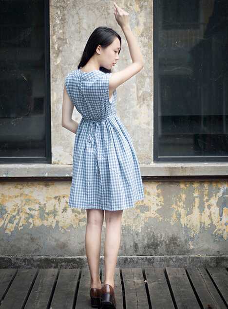 背心格子连衣裙,超文艺范的感觉必定是格子控女生的最爱款吧,搭配复古风的粗跟鞋子,增高又舒适,侧一边的卷发,颇具女人味。