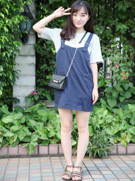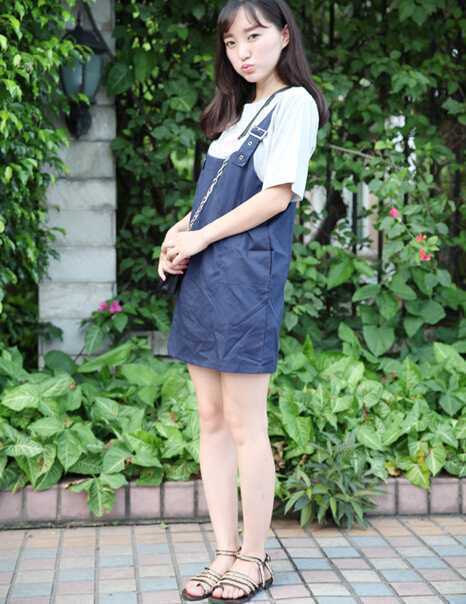 长款的背带裙一样很美减龄呢,简单搭配嫩蓝色t恤衫,就很可爱咯,迷你包包随意拎着,随时时尚出游踏青哦!