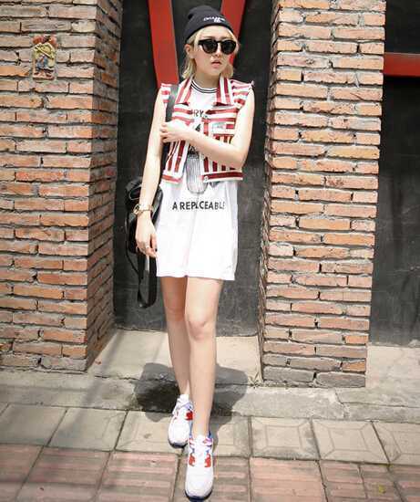休闲风长款t恤衫搭配搭配条纹马甲,巧遮小粗臂,让你穿出更加潮流时尚呢~~~