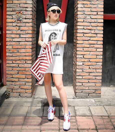 个性人像图案长款t恤衫搭配,休闲宽松的款式,很时尚有范儿,搭配红白运动鞋,很好的与上衣颜色相呼应,看得出的搭配小心机,加上一对墨镜和帽子,打造街头休闲时尚风。
