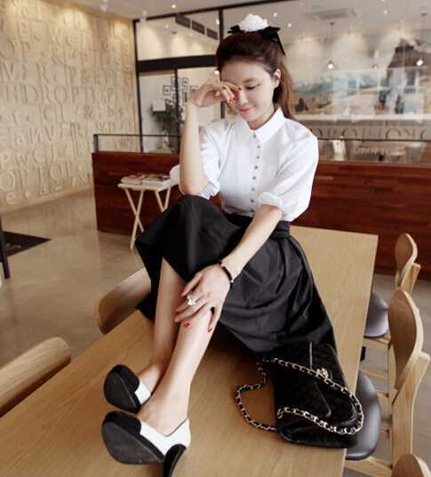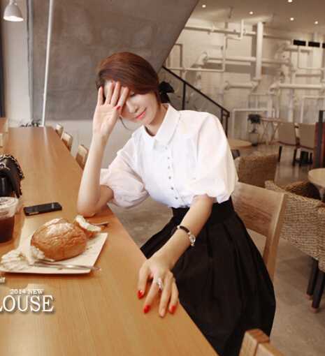 泡泡袖彼得潘领衬衫,搭配黑色高腰半身裙,很甜美可爱,秀出你的美腿,加上一对黑白配高跟鞋,很优雅大气~~~~