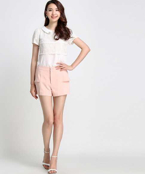 彼得潘领白色衬衫,束腰搭配短裤,很显高显瘦哦,这样的穿搭法超潮呢。