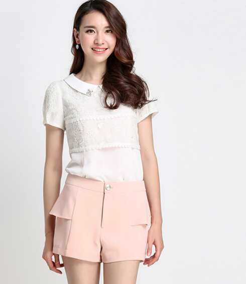 减龄款彼得潘领衬衫,蕾丝的点缀增添了几分时尚度,搭配粉色短裤,休闲不失甜美,简单搭配白色高跟鞋,很百搭好看。