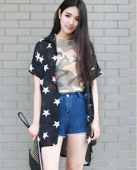 牛仔短裤搭配运动休闲鞋,在加上黑色长款防晒衫,让你夏日轻松遮阳秀出时尚风。