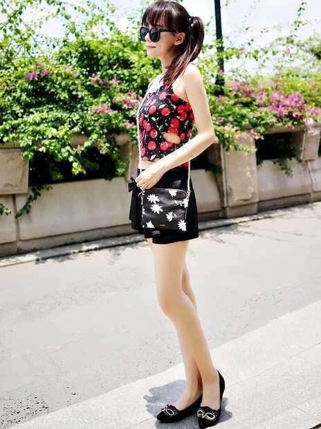 樱桃印花背心衫,带给你清凉般的夏日感受,搭配黑色短裤,百搭又显细腿,加上一对可爱的平底鞋,穿出舒适时尚范。