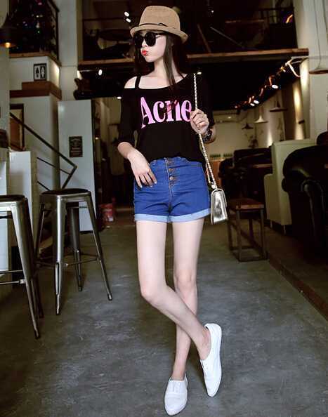 高腰牛仔短裤搭配T恤,很简单舒服的一套装扮,炎热的夏天就该这样穿~~~