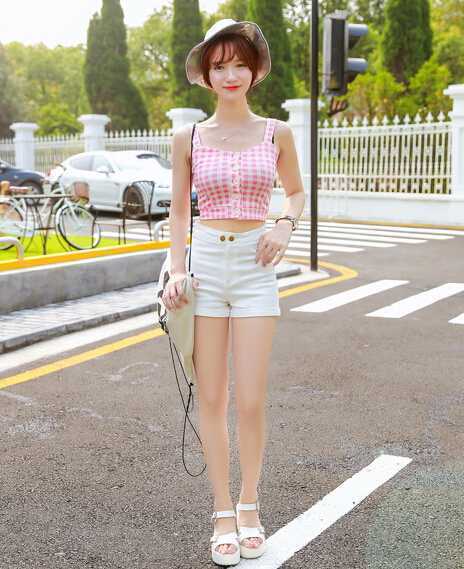 修身款格子吊带短款上衣,散发出小清新的味道哦,搭配高腰白色短裤,秀出纤细的美腿,加上一对厚底高跟鞋,轻松打造出苗条身材,让你时尚清凉出街。