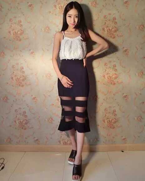 侧面看吊带衫搭配包臀半身裙,凹出极具性感魅力感的前凸后翘好身材,颇具女人味,搭配黑色厚底高跟鞋,让你轻松增高显时尚哦。
